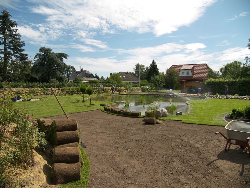 Verlegung von Rollrasen um einen Schwimmteich als Liegewiese