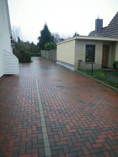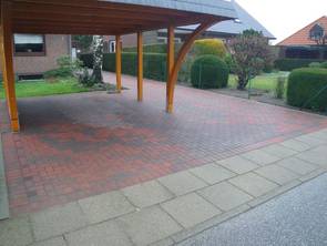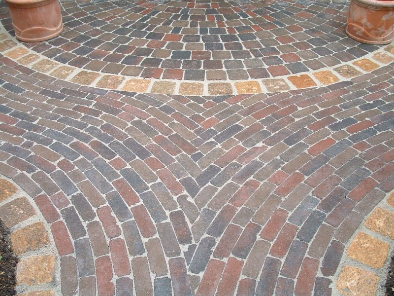 Betonsteinpflaster aus Belgien, eingerahmt von Porphyr-Kleinpflaster