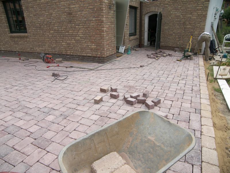 Das Betonpflaster ist verlegt, jetzt werden die Steine paßgenau zugeschnitten